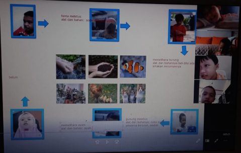 DEPOK – Siswa Taman Kanak-kanak Islam Terpadu (TKIT) Nurul Fikri dari kelas A melakukan kegiatan penyampaian judul dan bahan proyek dihadapan para teman dan gurunya secara daring, Senin (1/3/2021).