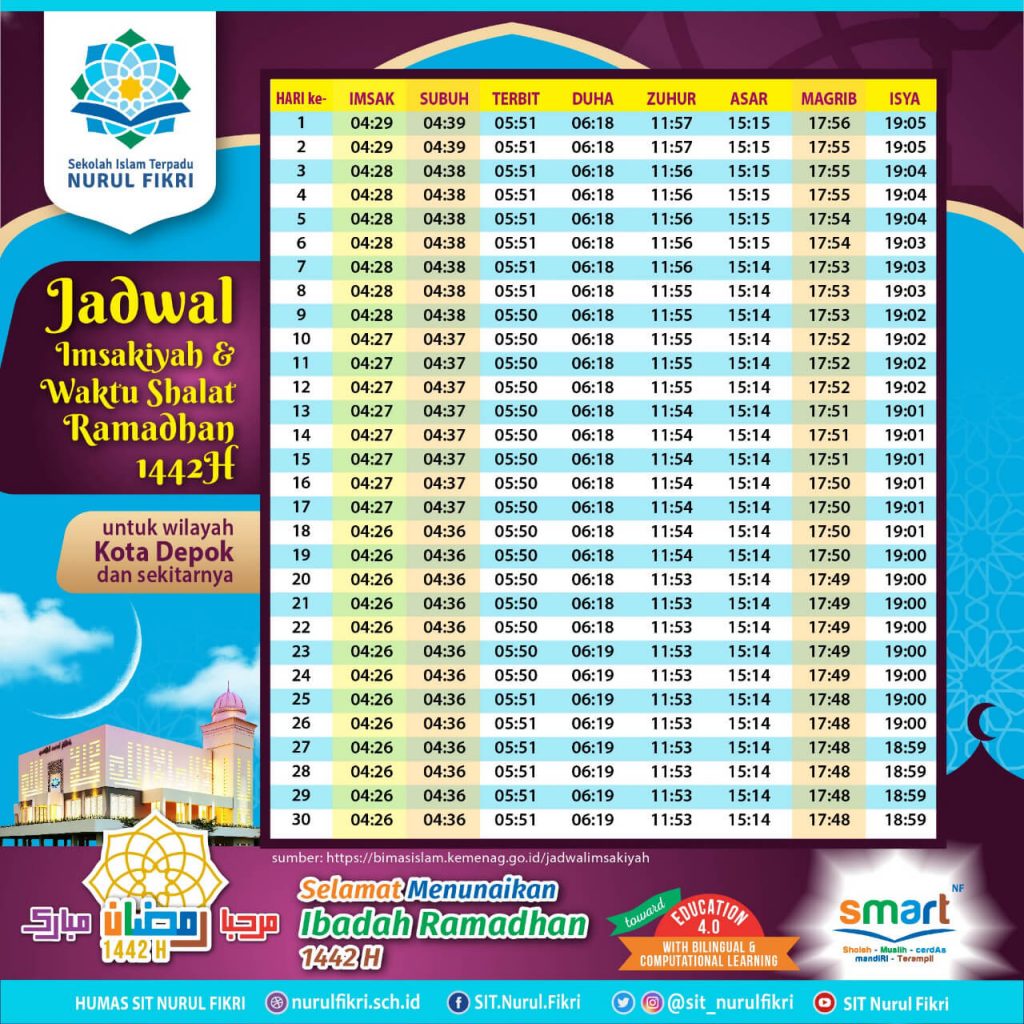 Jadwal Imsakiyah dan Waktu Salat Wilayah Depok SIT NURUL FIKRI Jadwal Imsakiyah dan Waktu Salat Wilayah DepokDEPOK - sebentar lagi umat muslim dunia akan menunaikan ibadah suci Ramadhan 1442 H. Untuk…HUMASApril 9, 2021