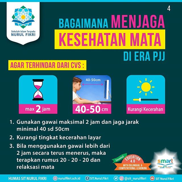 Tips Menjaga Mata Agar Terhindar CVS SIT NURUL FIKRI Tips Menjaga Mata Agar Terhindar CVSnurulfikri.sch.id -- Pandemi Covid-19 mengharuskan anak-anak belajar di rumah menggunakan sistem daring (dalam jaringan). Hal…HUMASOctober 16, 2020