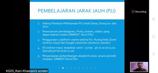 “Penggunaan dua platform utama selama PJJ: Ruang Kelas Zoom (sinkron maya) dan Google Cclassroom (asinkron mandiri),” terangnya. PJJ sinkron maya terjadwal Senin – Jumat pukul 07.00 – 12.00 WIB, kecuali Jumat sampai dengan pukul 11.20 WIB.